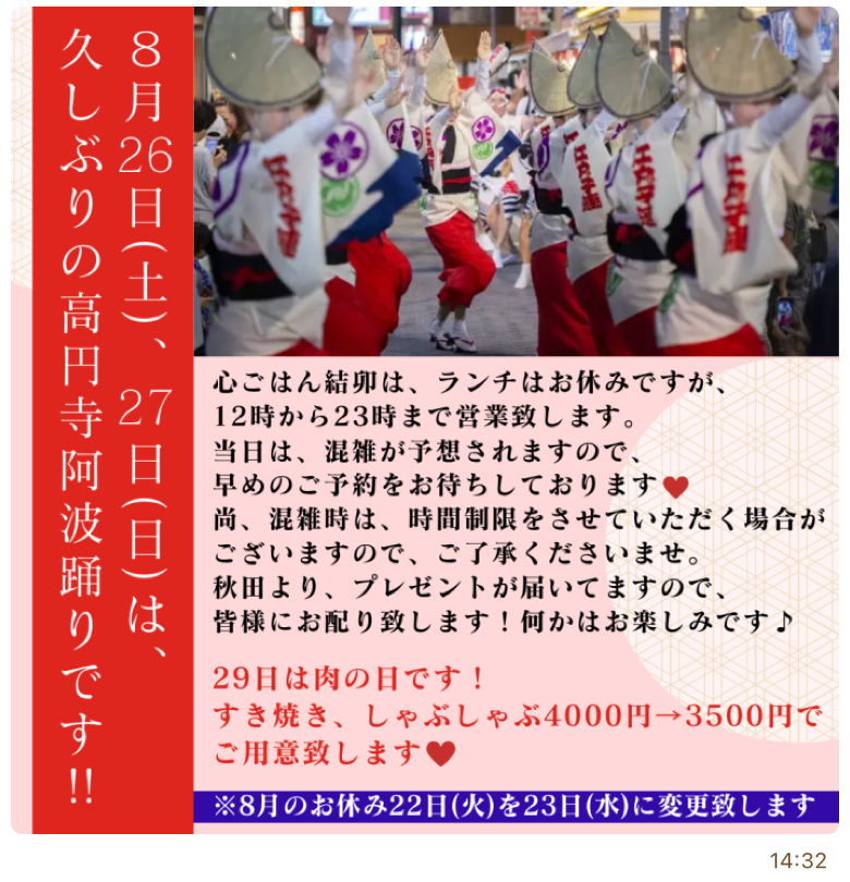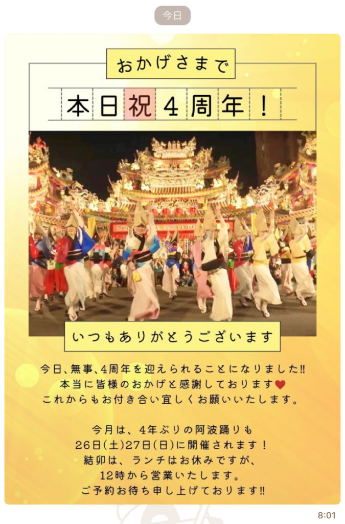 8月8日、22日はお休みを頂きます。