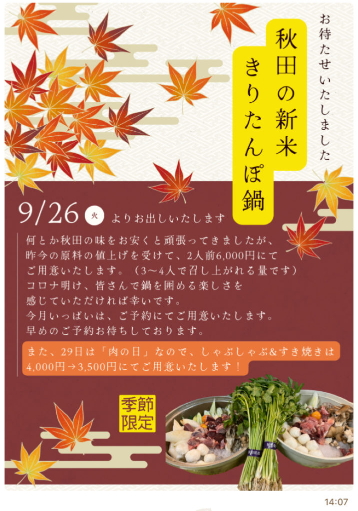 今日からきりたんぽ鍋始めまーす!