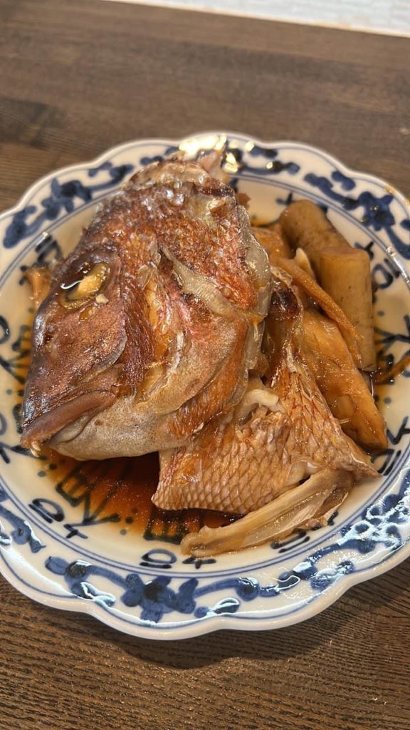 今日の日替わり、鯛の兜煮、小鉢はきりこぶ煮とナスの揚げ浸し、牛肉の炊き込みご飯、なめこの味噌汁です!